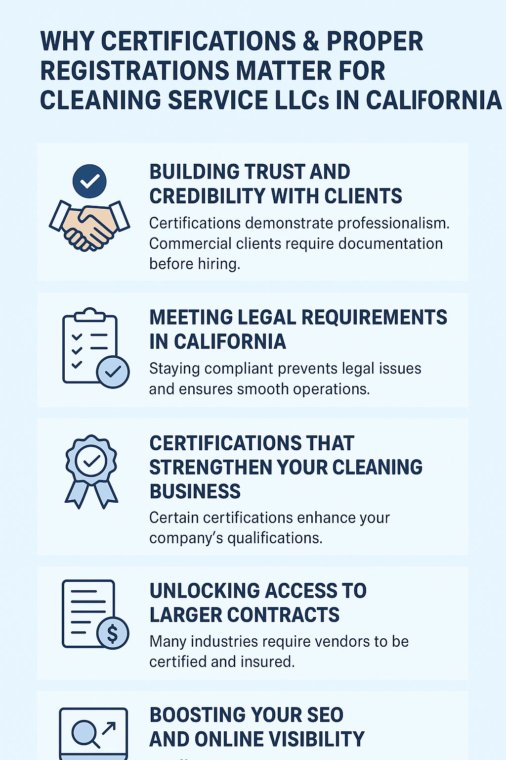Certifications and legal registrations are more than formalities. They help cleaning service LLCs in California build trust, access bigger contracts, stay protected, and improve online visibility.